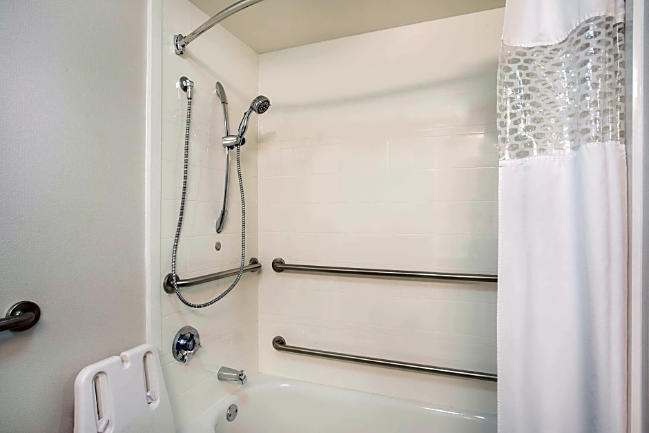 A flat-screen TV with HD channels and luxury bedding are featured in this hearing accessible double room. A microwave, refrigerator and work desk are included as well.